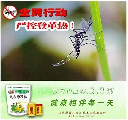 而从中医角度看,登革热属温病范畴,归为暑燥或湿热疫症,需清热降火,化湿解毒。温病经典名方《桑菊饮》的配伍及功效就很好地体现了这一原则。白云山星群夏桑菊正是源于清代吴鞠通《温病条辨》的经典名方《桑菊饮》,其具有清肝明目、清热解毒、疏风散热、解疮毒之效,现代药理研究也表明,星群夏桑菊拥有特有有机酸类、生物黄酮类保密功效成分,具有显着的抗菌消炎、抗病毒、解热镇痛作用,能直接杀灭或抑制肺炎克雷伯氏菌、呼吸道合胞病毒等。同时还独家获防治流感、禽流感专利(专利号:ZL200610005382.2)。
