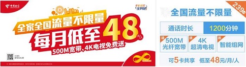 家庭用户办理深圳电信全国不限流量套餐,除可享受全国流量不限量以外,套餐内还可免费赠送500M光纤宽带和4K超清电视。用户还可以根据家庭需要,额外申请最多4张副卡,即套餐内的流量、语音最多可支持5人共享。