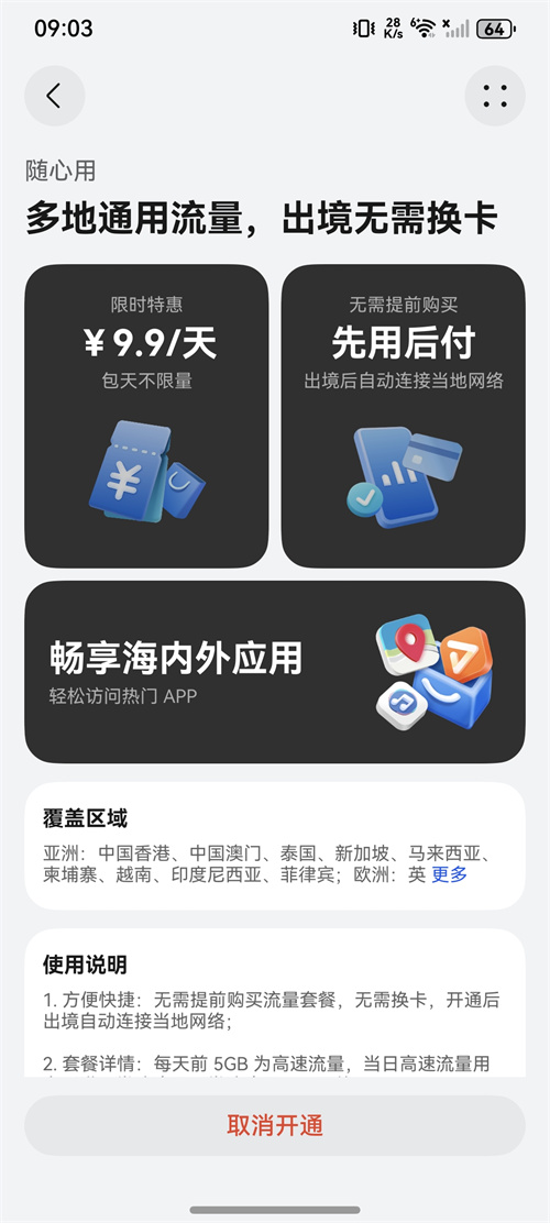 天际通9.9元/天多地流量随心用 落地即连网络不间断